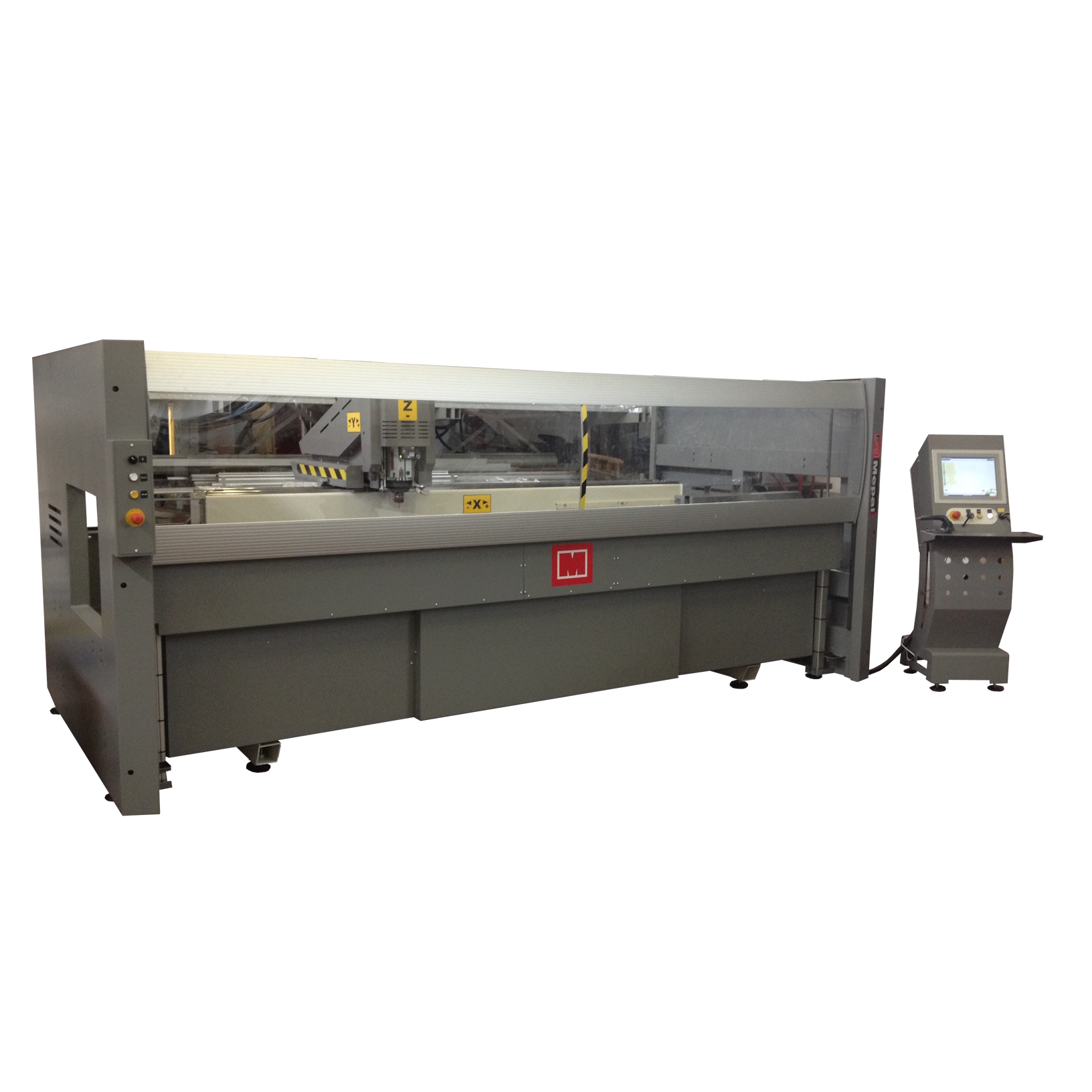 Il centro di lavoro Atlantis C3SR è una fresatrice verticale a controllo numerico per profili in Alluminio, PVC ed acciaio con la capacità di lavorare i pezzi su 3 facce. C3SR ha la rotazione della trave pneumatica: +90°/0°/90°, gli angoli intermedi si ottengono con battute meccaniche; come opzione è possibile richiedere la rotazione della trave controllata da CNC da -90° a +90°. Il numero di giri del mandrino è regolabile da 2800 a 18000 RPM attraverso inverter. Interpolazione a controllo numerico degli assi X e Y. I movimenti degli assi X, Y e Z sono realizzati attraverso motori digitali brushless. La macchina è completa di 4 morse pneumatiche a doppio effetto per il bloccaggio del pezzo e su richiesta un cambio utensili automatico e battute di riscontro pneumatiche. La correzione del diametro dell’utensile è compensata via software. La macchina può essere equipaggiata su richiesta con una protezione frontale o una cabina completa. È possibile richiedere lo spostamento automatico delle morse per evitarne errori di posizionamento. Il cambio utensili automatico può ospitare 6 utensili. Un carter fisso protegge gli utensili dal truciolo prodotto durante il processo di lavorazione.